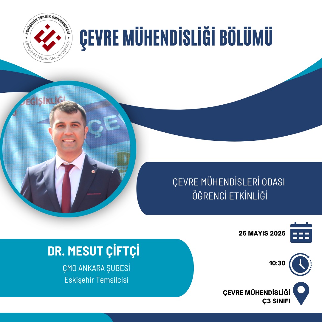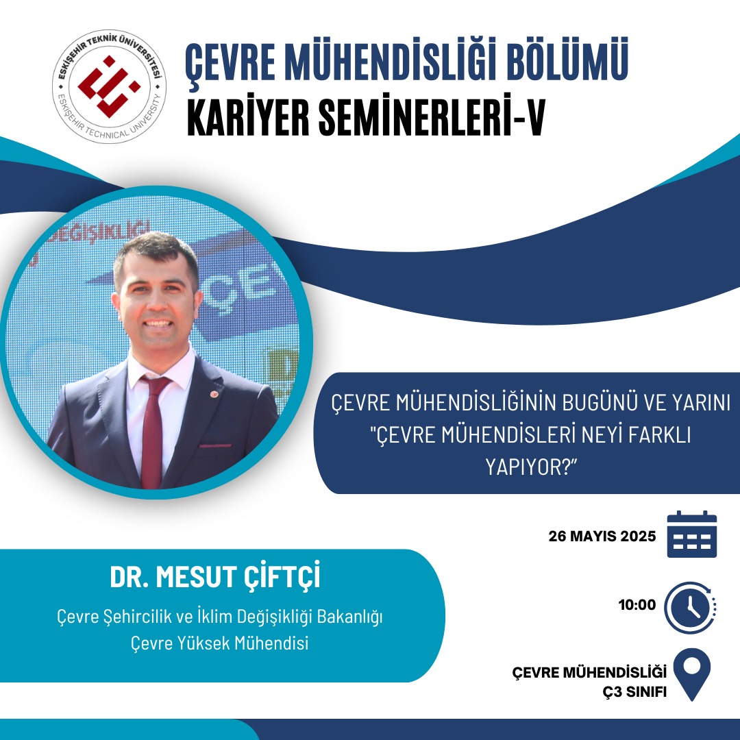 Çevre Mühendisliği Bölümü tarafından düzenlenen Kariyer Seminerleri serisinin beşincisi kapsamında, Çevre, Şehircilik ve İklim Değişikliği Bakanlığı Çevre Yüksek Mühendisi Sayın Dr. Mesut ÇİFTÇİ tarafından “Çevre Mühendisliğinin Bugünü ve Yarını: Çevre Mühendisleri Neyi Farklı Yapıyor?” başlıklı seminer verilecektir.